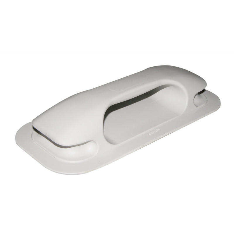 Può essere usata come base per un tienti beneo maniglia in corda. Si pratica un foro di diametroadeguato alla cima utilizzata, un nodo adinizio cima viene bloccato nell'apposito alloggiamentodella maniglia.Dim. mm. 240 x 105 x 45h