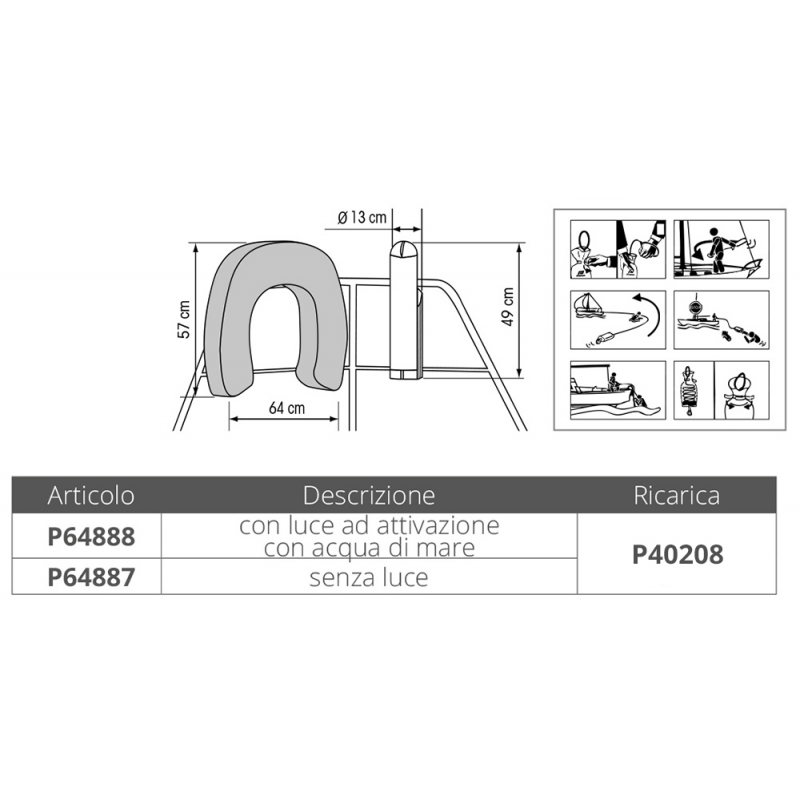 Salvagente gonfiabile a ferro di cavallo da lancio per il recupero di un uomo a mare, in nylon giallo spalmato poliuretano. Galleggiabilità 117N. Dotato di nastri riflettenti, di ancora galleggiante, fischietto e contenitore in ABS rigido fissato al supporto da un cordino.