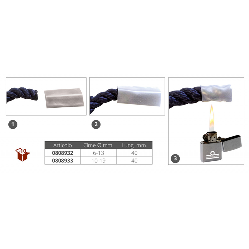 Capocorda termorestringente in PVC bianco morbido. Per rifinire in modo rapido e sicuro cime e trecce. Confezione 10 pz