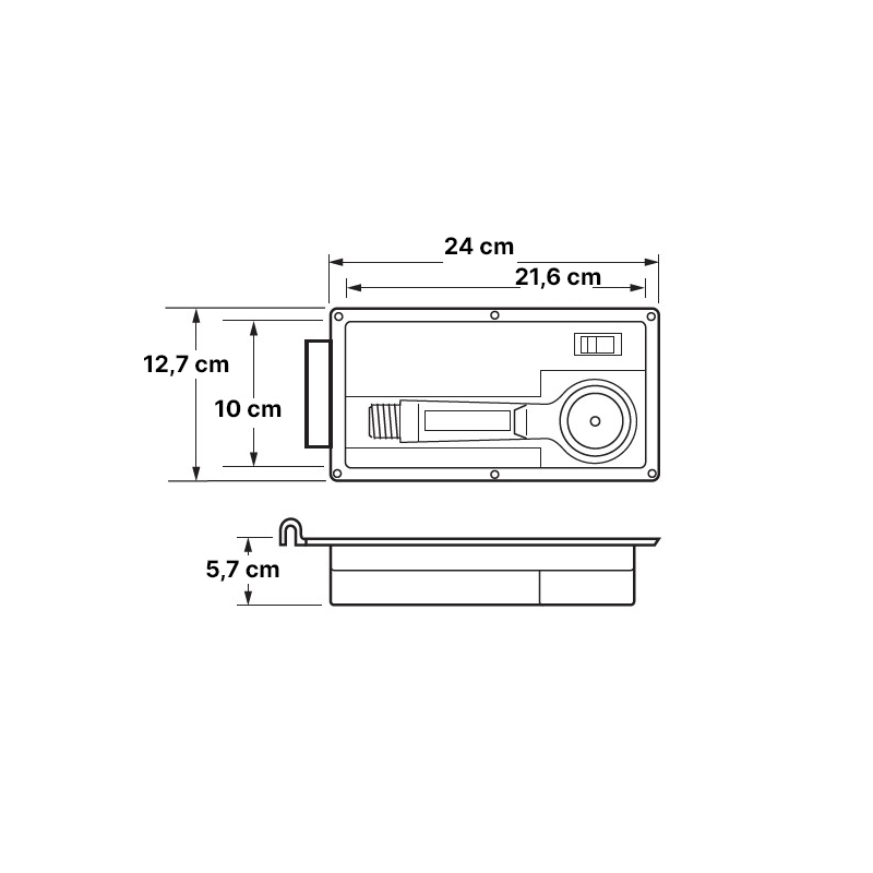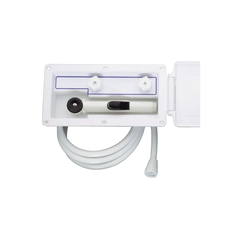 Contenitore porta doccia realizzato in plastica ad alto impatto, resistente ai raggi UV e alla corrosione.Viene fornito con tubo flessibile da 180 cm, doccetta, coperchio e comandi di chiusura e miscelazione caldo/freddo. Si collega al sistema di acqua dolce per la doccia. Installazione a filo.