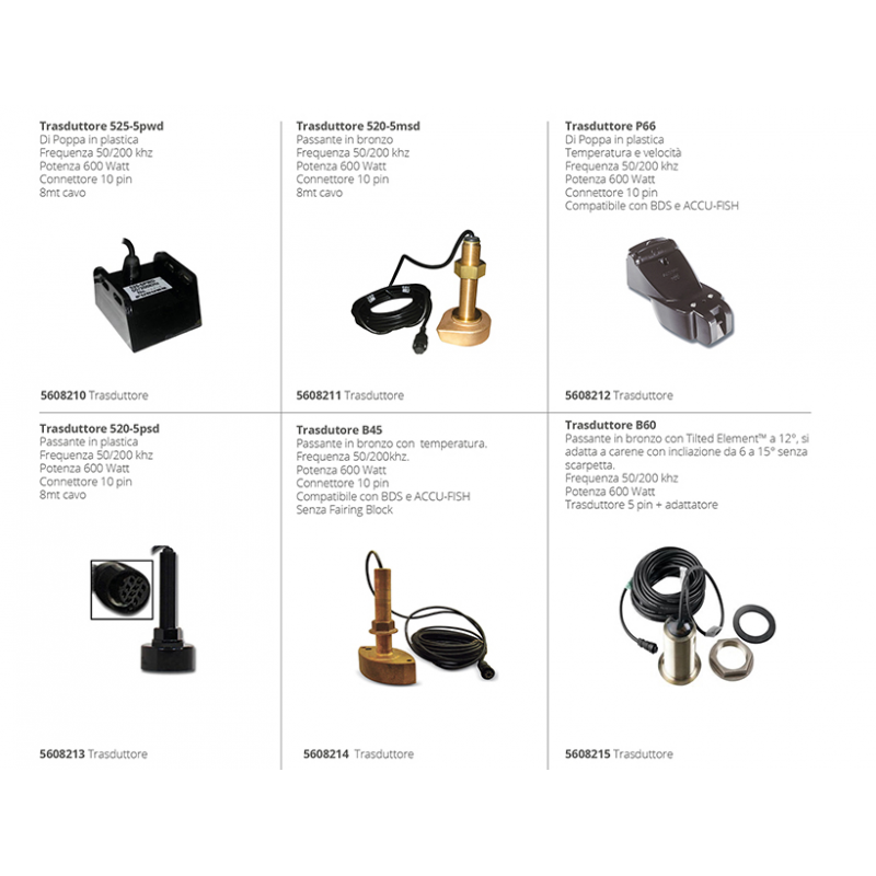 Ecoscandaglio stagno (ip56) con display da 5.7” VGA 480x640 ad alta luminosità grazie ad un display a colori che garantisce una chiara visibilità anche tramite l'uso di occhiali polarizzati. Dotato dell'ultima tecnologia BDS Bottom Discrimination Sounder permette, grazie all'ausilio di trasduttori passa scafo o di poppa da 50/200khz, un analisi del probabile fondo marino presente sotto l'imbarcazione, fornendo preziose informazioni per la ricerca delle zone ricche di pesce. La funzione ACCU-FISH è una rivoluzionaria caratteristica che permette di calcolare e segnalare con appositi simboli, le dimensioni del pesce, da un minimo di 10 cm ad un massimo di 199 cm, fino ad una profondità massima di 100 mt. Attivando l'opzione White Line Feature la parte anteriore all'eco, viene rappresentata di bianco permettendo una rappresentazione grafica più pulita e una discriminazione migliore dei pesci. Ruotando una semplice manopola è estremamente facile e intuitivo selezionare il gain desiderato al fine di migliorare la discriminazione tra rumore e eco ricevuto. Anche la scelta della frequenza e, di conseguenza della pagina da visualizzare, è gestita da un selettore che, come per il gain, permette in qualunque condizione di mare una rapida scelta della pagina voluta. Potenza di trasmissione 600 watt . Compatibile Nmea0183, può ricevere ed inviare informazioni digitali ad altri cartografici. Alimentazione 12-24 Vdc.