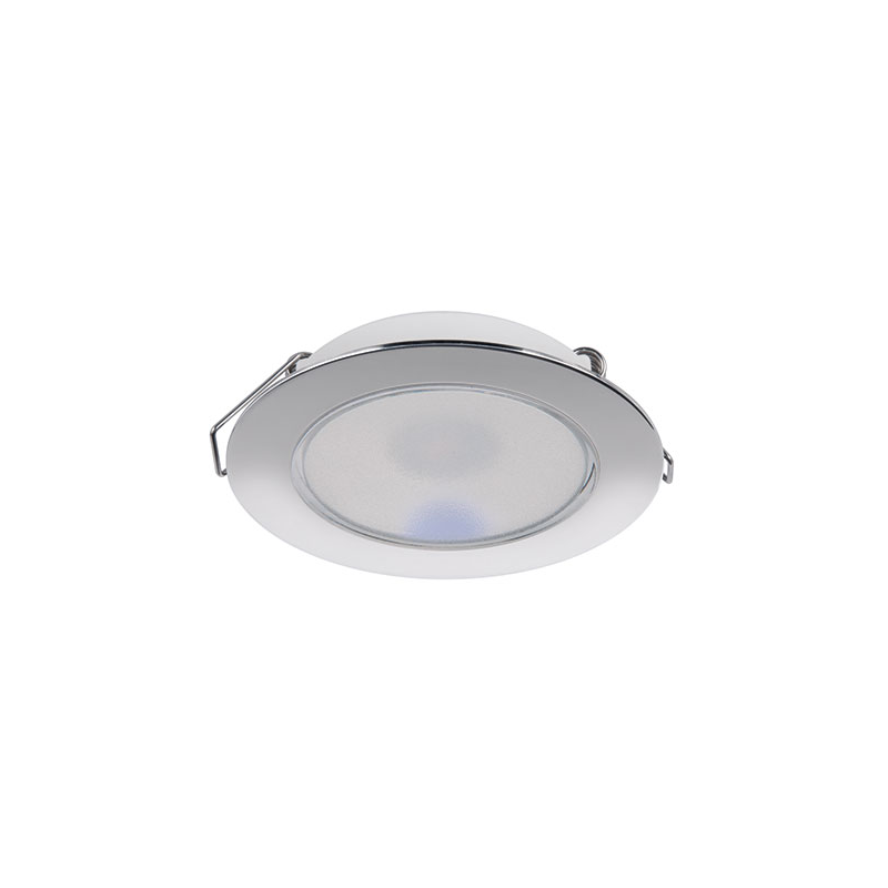 Faretto stagno IP65 a 2 LED (100 Lumen) ad alta luminosità, luce bianca calda con cornice circolare in acciaio inox AISI 316, con pulsante touch on/off e regolatore intensità. Sensibile alla polarità. Fissaggio con molle.
