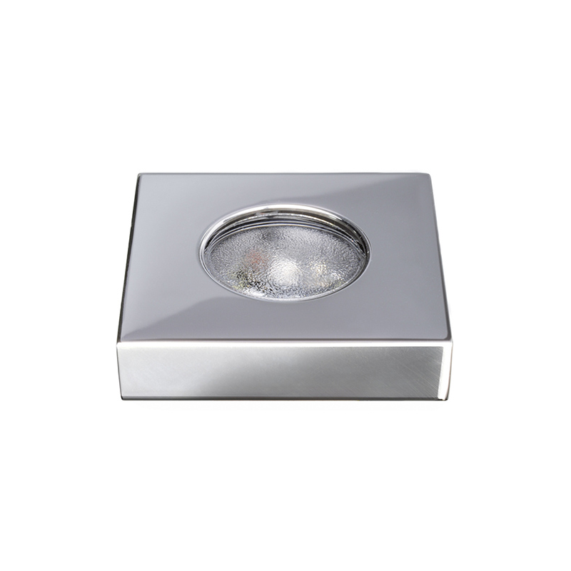 Luce di cortesia calpestabile ad incasso in acciaio inox AISI 316 lucido ad 1Led, stagna IP6, luce bianca calda. Alimentazione 10-30V. Consumo 1,5W circa. Non sensibile alla polarità