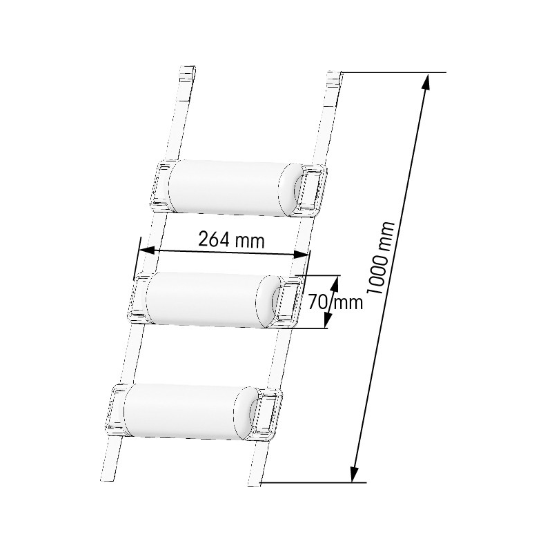 Parabordo in PVC formato da 3 piccoli parabordi a forma di mezzaluna, resistenti ai raggi UV posizionati lungo una cinghia con un anello passante su tutte e 4 le estremità. Si adatta a tutte le forme dello scafo, e in particolare al tubolare del gommone e del tender.