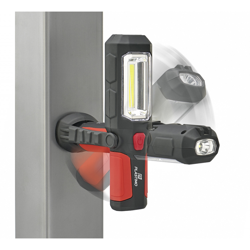 Luce da lavoro supporto dell'inclinazione magnetica per stabilizzare e inclinare la luce. Gancio di sospensione per appenderla a vari supporti. Magnete sul retro per ancorarla a parti metalliche. Luminosità 200 lumens per una visibilità massima indicativa di 30 mt. Peso di 170g senza batterie.Protezione dall'acqua IPx3. Modi d'uso: 1) Torcia 2) Spot